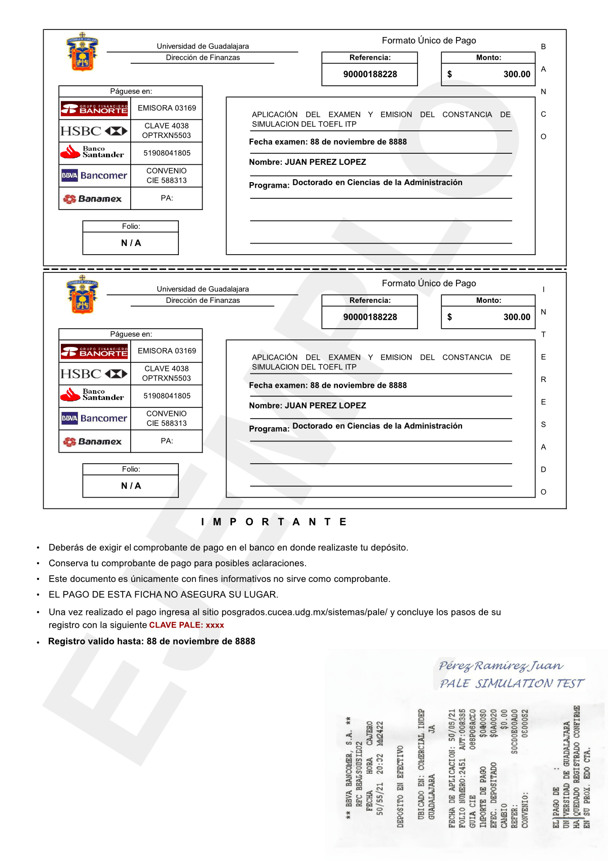 El PALE SIMULATION TEST es un examen realizado por el Programa de Aprendizaje de Lenguas Extranjeras PALE del Centro Universitario de Ciencias Económico Administrativas, esta prueba contempla 4 habilidades académicas del inglés (lectura, comprensión auditiva, expresión oral y escritura). La constancia emitida podrá ser utilizar en los trámites internos de UdeG.